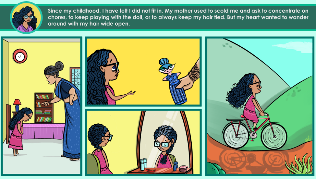 Dhee is the pictorial representation of an average small-town woman, from a middle-income family background, identifying as a lesbian, growing up, discovering herself and her sexuality, and interacting and living within a society that is prejudiced and unforgiving to diversity.