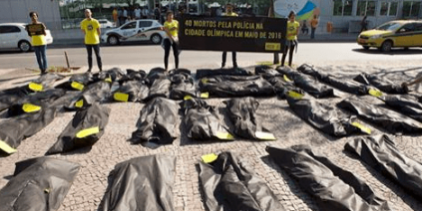 Forty body bags, representing the number of people killed by the police in May 2016 in Rio de Janeiro were displayed in front of the Local Organizing Committee for the Rio 2016 Olympics by Amnesty International’s activists in a peaceful protest.
