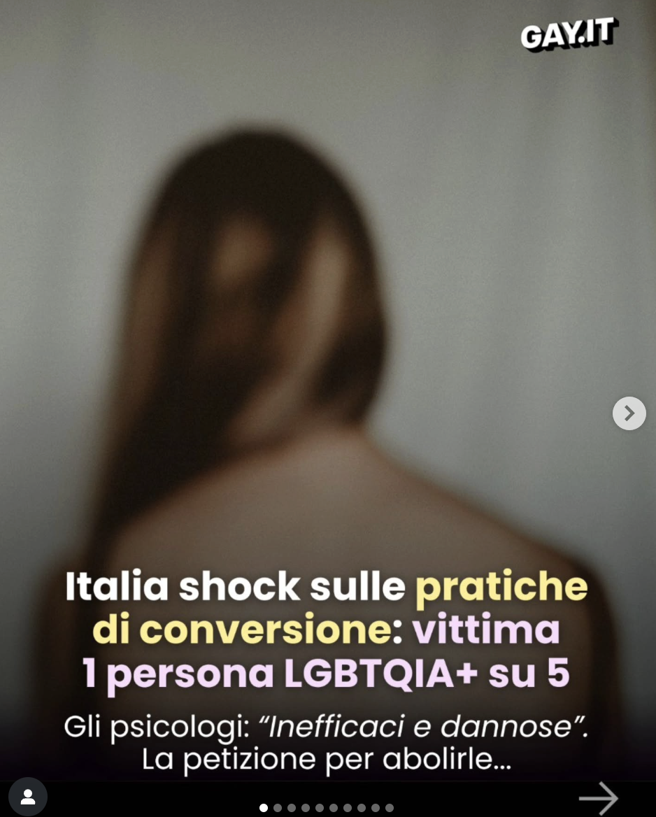 The core focus of our initial communication was that 1 in 5 LGBTQIA+ people in Italy has been submitted to practices to discourage or change behaviours related to LGBTQIA+ identities and expressions. (This figure comes from a European study by the Fundamental Rights Agency).