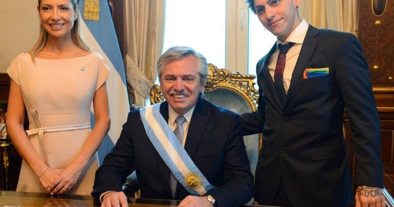 While there is no photo of the president in the Pride parade, here he is with his child, drag queen Estanislao Fernández, who is rocking a rainbow flag in his inauguration. © PinkNews